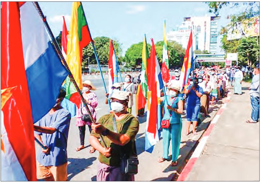 The people raised signboards written as: “We support the State Administration Council and Myanmar Armed Forces, which protects the nationality, language and religion.