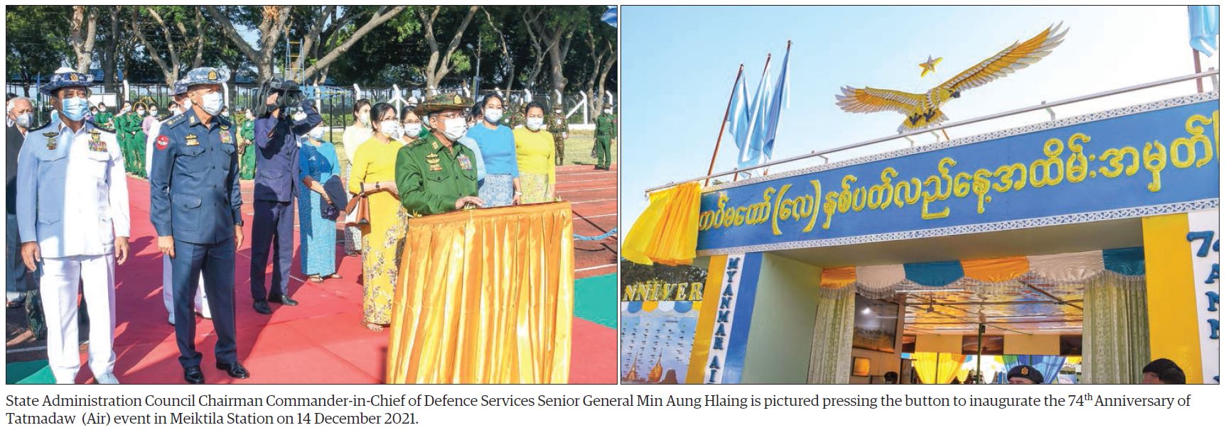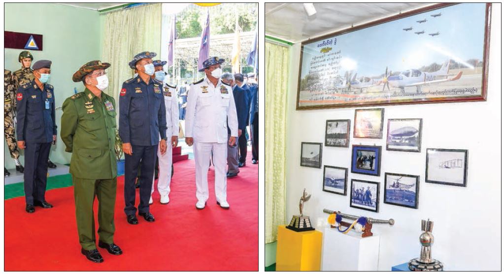 The Senior General pressed the button to open booths to mark the 74th Anniversary of Tatmadaw (Air) and souvenir shops. Together with the attendees to the ceremony, the Senior General viewed around the records of aviation history, uniforms of the Tatmadaw (Air) in successive eras, documentary photos on the Tatmadaw (Air), documentary photos of those who served as the Commanders-in-Chief (Air), documentary photos on the performances of the Tatmadaw (Air) in the Mongyawng, Methawaw and Sisiwam-Tapan clashes, photos of those from the Tatmadaw (Air) who won gallantry medals, the commissioning ceremonies of airplanes and helicopters into services at the Tatmadaw (Air), training of officers, other ranks and files, and substituted staff of the Tatmadaw (Air), documentary photos on international relations, development of the Tatmadaw (Air) from 2012 to 2020, documentary photos in awarding outstanding fighters in the successive Commanders-in-Chief (Air), avionic devices used at airplanes and helicopters, scale models of modern new generation aircraft, pilot equipment, VNR-AF-1 of the Tatmadaw (Air), security of military personnel, preventive measures of the virus and machinery displayed at the booths.