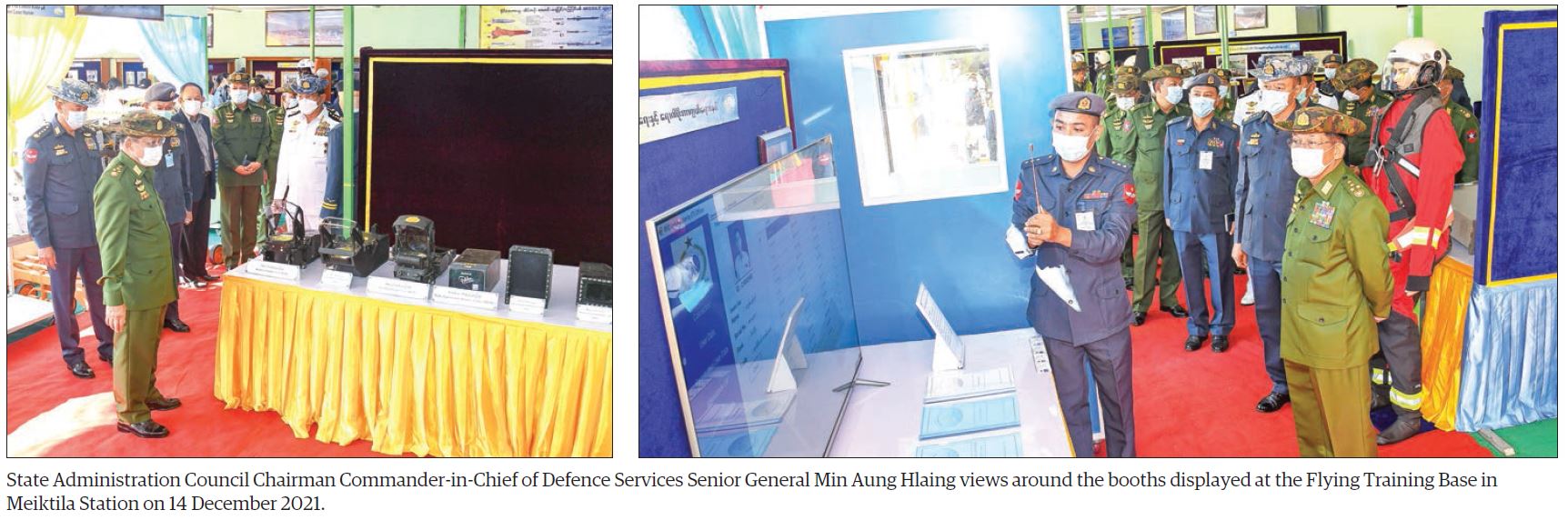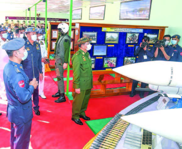 CHAIRMAN of the State Administration Council Commander-in-Chief of Defence Services Senior General Min Aung Hlaing, wife Daw Kyu Kyu Hla and senior military officers visited the booths in commemoration of the 74th Anniversary of Tatmadaw (Air) displayed at the headquarters of Flying Training Base in Meiktila Station yesterday morning.