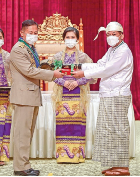 The Senior General presented the Thray Sithu title to Vice-Chairman of the State Administration Council Deputy PrimeMinister Vice-Senior General Soe Win, the Sithu title for recipients through SAC member General Mya Tun Oo, the Thura title to the wife of Lance Corporal Thet Shay from No 207 Light Infantry Regiment, the Zeya Kyaw Htin title for 17 recipients through Lt-Gen Kyaw Swa Lin and the Wunna Kyaw Htin to two recipients through U Maung Ko.