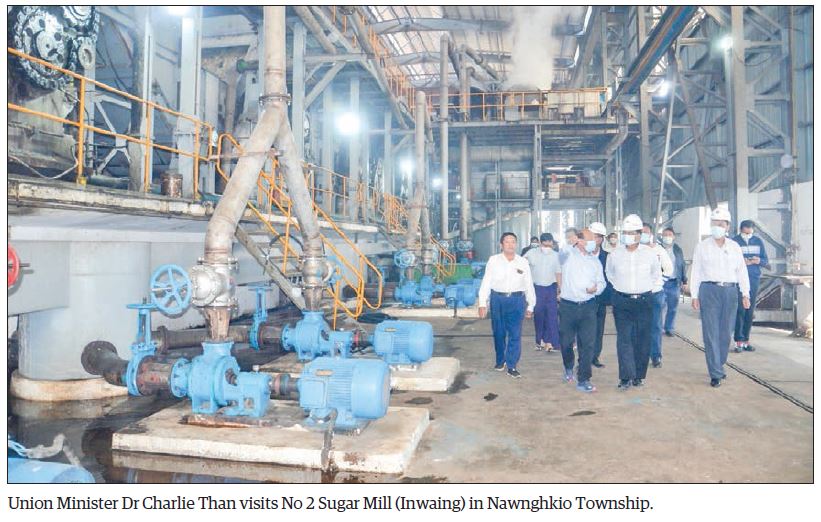 After that, the Union Minister visited No. 2 Sugar Mill (Inwaing) in Inwaing Village tract, Nawnghkio Township, Kyaukme District, and inspected the stages of the sugar production process and the No. 3 Sugar Factory Project (Inwaing) project which is producing 12,000 tons of sugar per day.