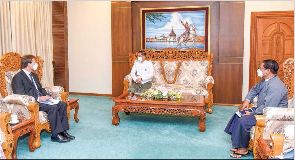 U Ko Ko Hlaing, Union Minister for International Cooperation received Mr David Carden, Deputy Humanitarian Coordinator of the United Nations in Myanmar on 8 February 2022 at 11:00 am at the meeting room of the Union Minister at the Ministry of International Cooperation.