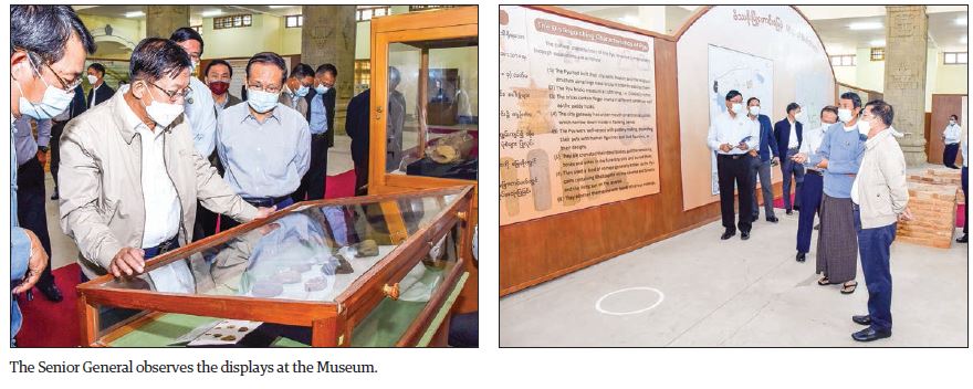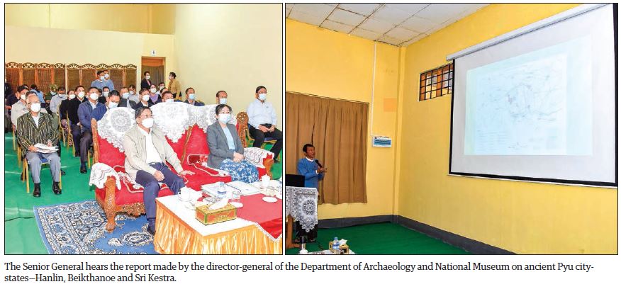 After hearing the reports, the Senior General said as ancient Pyu states included on the list of World Heritage sites are invaluable, it is necessary to systematically maintain the ancient cultural heritage sites and environs. The walls and ancient heritage works underground may face damaged, excavation for them must be undertaken in time. As the government will provide necessary assistance, further excavation and maintenance of ancient Hanlin, Beikthanoe and Sri Kestra cities must go on. Exposing the ancient cultural heritage will reflect measures of valuing the State, strengthening the nationalistic spirit and adoring the ancient cultural heritage. As these ancient cities are symbols of the Magway Region as well as the country, maintenance of the world cultural heritage will help develop the region.