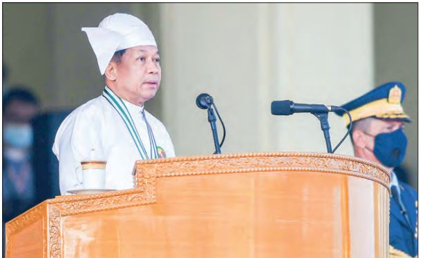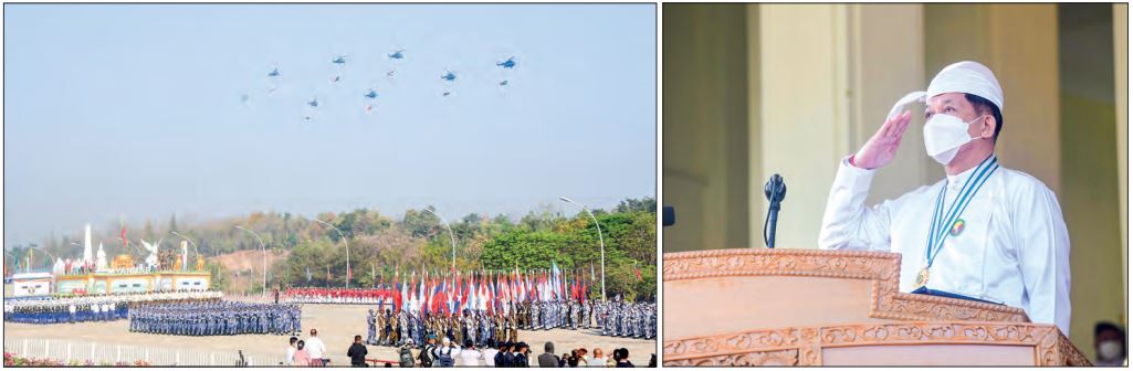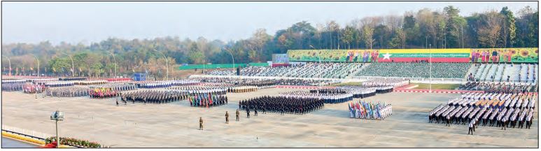 CHAIRMAN of the State Administration Council Prime Minister Senior General Maha Thray Sithu Min Aung Hlaing delivered an address at the ceremony to honour Diamond Jubilee Union Day 2022 and took the salute of columns of honour at the Grand Military Parade Ground in Nay Pyi Taw yesterday.