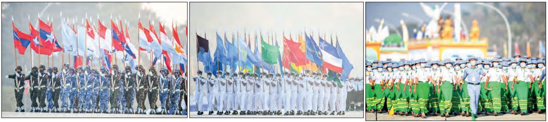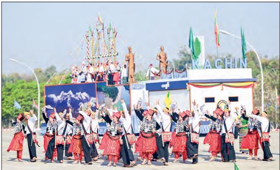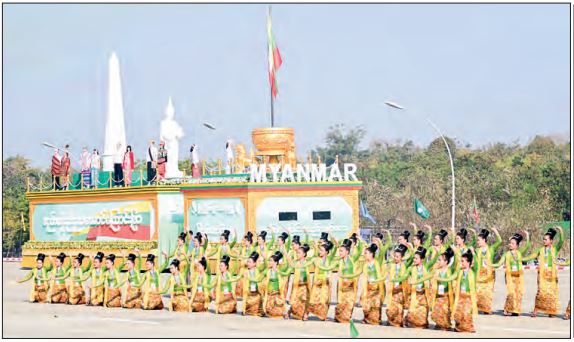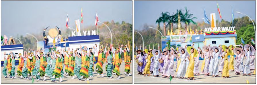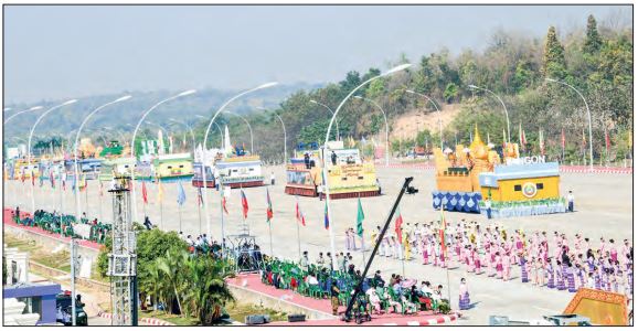 Then, decorated floats representing Nay Pyi Taw Union Territory, Kachin, Kayah, Kayin and Chin states, Sagaing, Taninthayi, Bago, Magway and Mandalay regions, Mon, Rakhine and Shan states, Yangon and Ayeyawady regions displaying emblems of the ethnics, lifestyle, traditions and customs as well as products presented song and dance performances. Yazar squadron led by Lt-Col Kyaw Aung flew over the decorated floats in fan break form with shooting flares.