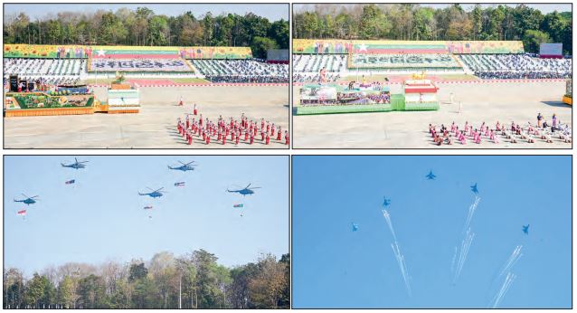 Meanwhile, military aircraft from Gyogyar, Arkar, Yanaung, Yeman, Yekkha, Thurein and Yazar squadrons in various forms flew over the parade ground to salute the Senior General, hanging the Union Flag, region and state flags, releasing the colourful smoke trails.