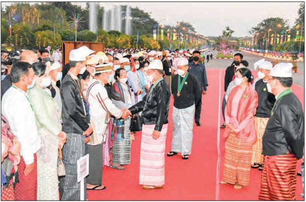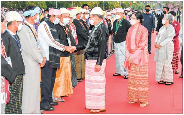 Then, the Senior General, Vice-Senior General and wives cordially greeted state/region ethnic cultural groups, chairpersons and representatives of political parties, members of peacemaking organizations, representatives of seven NCA signatories and four non-NCA signatories, region/state ethnic affairs ministers, deputy ministers, senior military officials, region/state Chief Ministers, Union Ministers, Union level officials and SAC members.