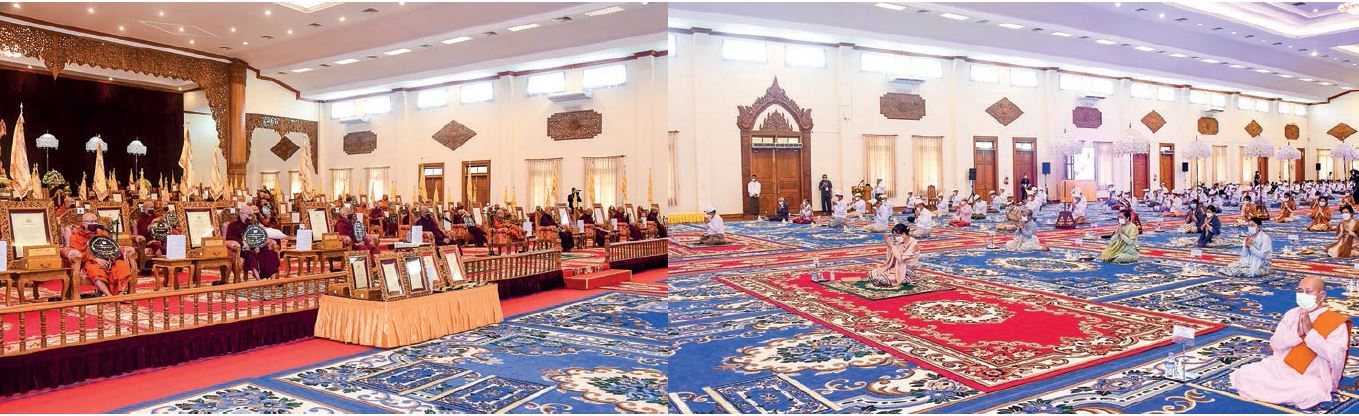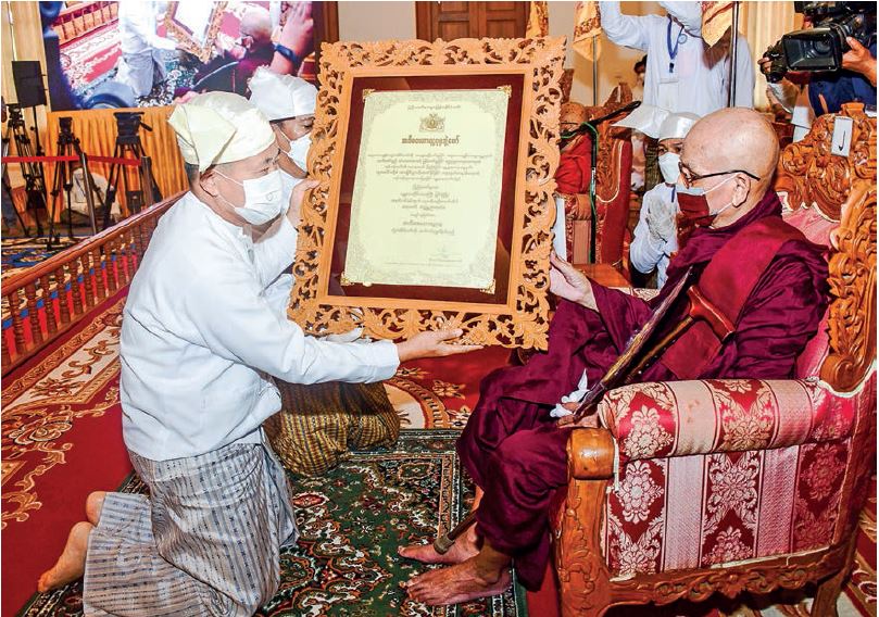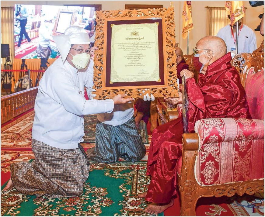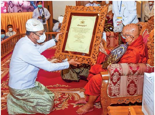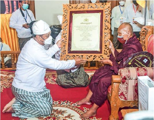 Then, SAC member General Mya Tun Oo conferred the title of Abhidhaja Maha Rattha Guru to Sayadaw Bhaddanta Tiloka Bhivamsa of Insein Ywama Pariyatti Monastery while Admiral Tin Aung San to Sayadaw Bhaddanta Narasaba Bhivamsa of Waizanyanta Monastery of Monyo Township Bago Region.