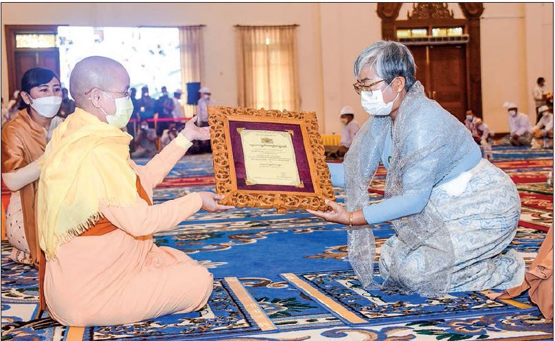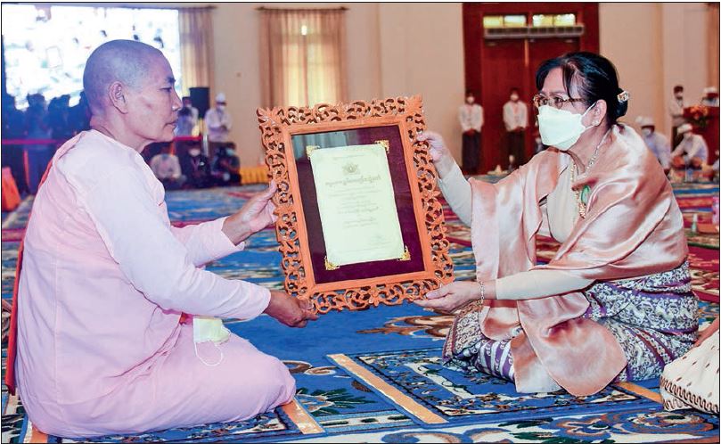 Afterwards, the wife of Senior General presented Agga Maha Ganthavacaka Pandita Title to Nun Daw Aeinda Theingi of the Sasana Beikman Nunnery of Sagaing Township and Daw Aeinsana Vati of Daw Vizanandi Kantha Nunnery of Sagaing Township, while the wife of Vice-Senior General presented Agga Maha Ganthavacaka Pandita title to Dr Daw Sekavati of Chan Myae Gone Wai Pariyatti Paripatti Parahita Nunnery of Mayangon Township.
