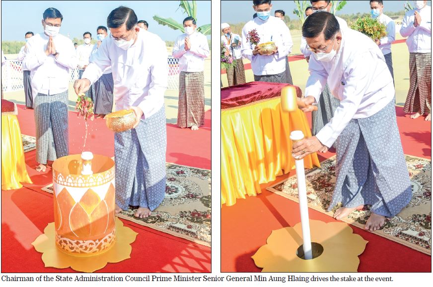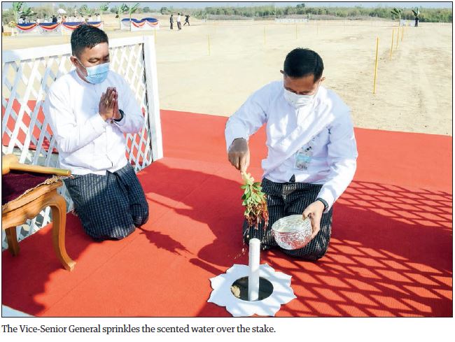 The Senior General and party took place at respective places to drive the stakes under the ancient traditions and performed the stake driving at the blessing time. Then, led by the Sayadaws, they recited the hymns beginning with “Jayantaw Bodhiya Mule”, and the ceremony was concluded after three recitations of Buddha Sasana Siran Tittatu.