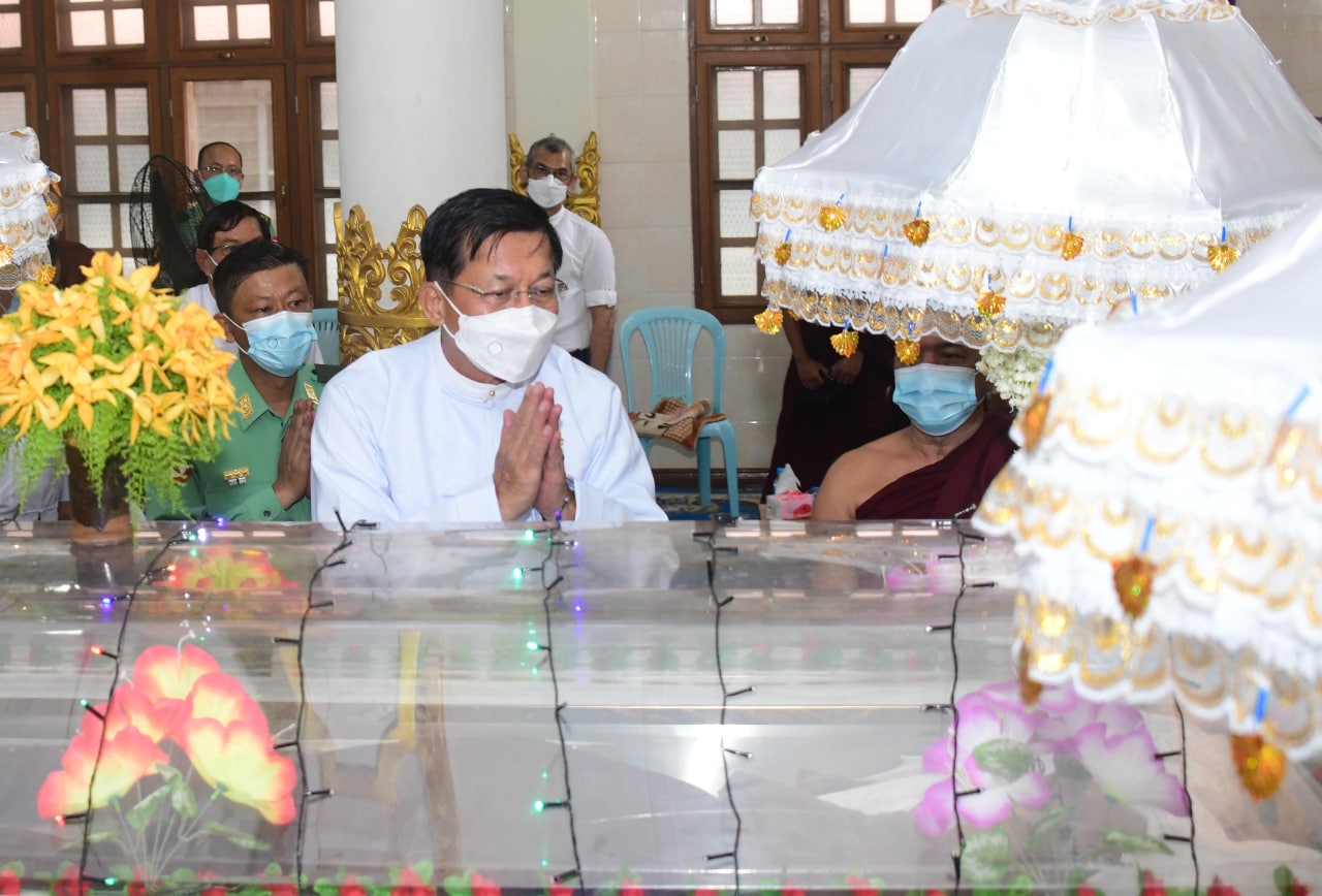 SAC Chairman Prime Minister Senior General Min Aung Hlaing pays homage to remains of late State Ovadacariya Chairman of Shwegyin Nikaya Dhipati Presiding Sayadaw Dhamma Senapati 15th Shwegyin Sangharaja Abhidhaja Maha Rattha Guru Abhidhaja Agga Maha Saddhamma Jotika Bhaddanta Vijjota of Vijjotayon Monastery