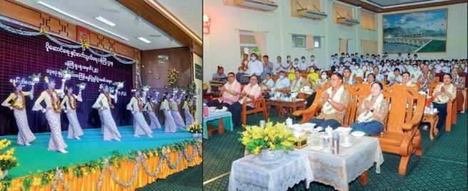The staffers performed Thingyan dances, and the Union minister and his wife awarded the coral dance troupes and sprinkled Thing yan water on them.