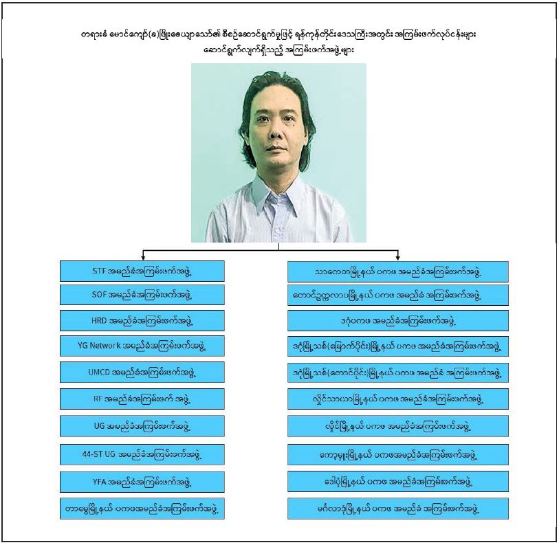 Defendant Maung Kyaw (aka) Phyo Zeyar Thaw gave weapons provided by NUG to 20 terrorist groups — STF, SOF, HRD, YG network, UMCD, RF, UG, 44-ST UG, YFA, Tamway PDF, Thakayta PDF, South Okkalapa PDF, Dagon PDF, Dagon Myothit (North) PDF, Dagon Myothit (South) PDF, Hlinethaya PDF, Hline PDF, Kawhmu PDF, Dawbon PDF and Mingaladon PDF to launch attacks on innocent civilians in Yangon Region.