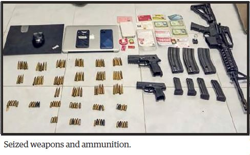 NUG member terrorist Maung Kyaw (aka) Phyo Zeyar Thaw was arrested with two Sig Sauer pistols, 48 9mm bullets, one M-16 rifle and 74 5.56 bullets at room B-0907 of the Apartment 3/B of the Yadana Hninsi Housing, in Yadana Road of Dagon Seikkan Township on 18 November 2021.