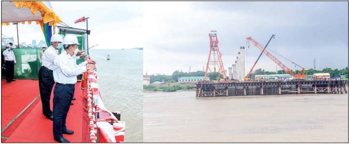 The Senior General and party inspected the construction of main bridge pylon 2 on Yangon bank of the project site where officials conducted the Senior General and party round the progress of works.