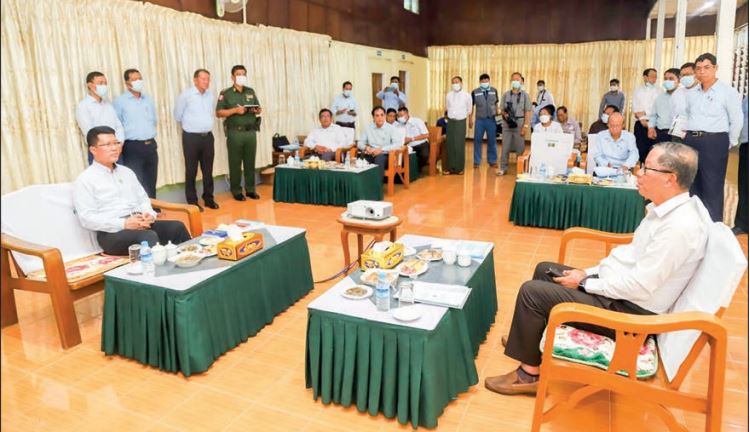 UNION Minister for Agriculture, Livestock and Irrigation U Tin Htut Oo, accompanied by Ayeyawady Region Chief Minister U Tin Maung Win, held a meeting with directors-general from departments, region-level department officials at the Panhlaing sluice gate project area near Moemakha village in Nyaungdon Township on 25 June. The meeting discussed flood prevention activities in the rainy season and taking measures of natural disasters, issues related to increase seeds, inputs and technical sharing to improve agriculture and livestock prevention, and private sector investment promotion.
