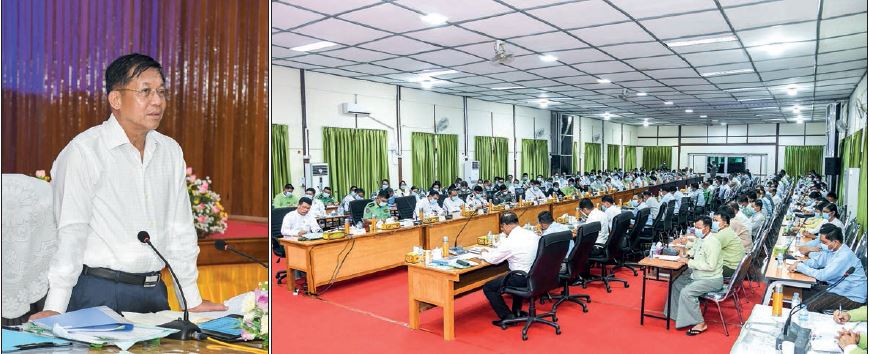 First, the chief minister and responsible personnel of Ayeaywady Region presented to the Chairman of the State Administration Council and Prime Minister the progress of implementation of the guidance given by him during his tour of the region in 2021, expansion of districts and employment of staff, measures taken for agricultural and livestock breeding sectors, steps taken for irrigation and electric power generation and distribution, efforts being made for increasing monsoon rice yield, production of meat, fish and eggs for local consumption, protection of the natural environment, public housing, operation of factories in industrial zones, expansion of the people’s hospital, the opening of schools, colleges and universities and development of social, economic and health sectors.