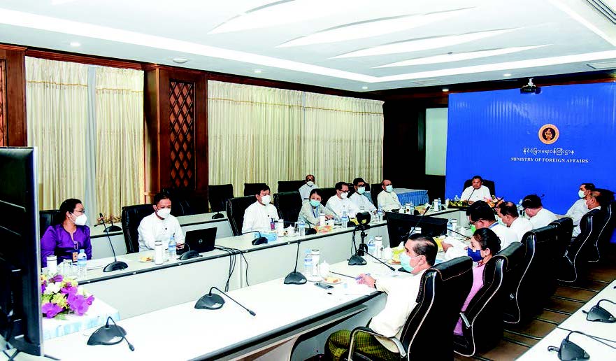 UNION Minister for Foreign Affairs U Wunna Maung Lwin and Union Minister for International Cooperation U Ko Ko Hlaing co-hosted a video conferencing on clarification of the guidance of the State Administration Council Chairman Prime Minister with Myanmar Ambassadors, Permanent Representatives, Consuls-General and Charge d’affaires of embassies in foreign countries, from the Ministry of Foreign Affairs yesterday.