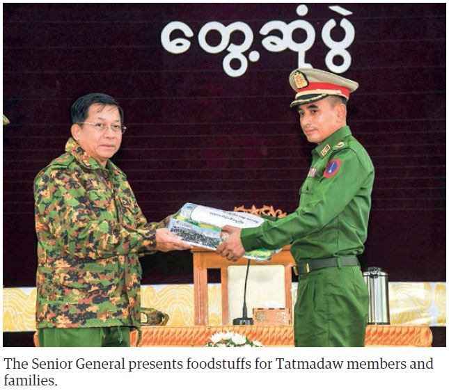 The Senior General presented foodstuffs for Tatmadaw members and families to the station commander and the wife of the Senior General gave cash assistance for the station maternal and child welfare association to the wife of the station commander.