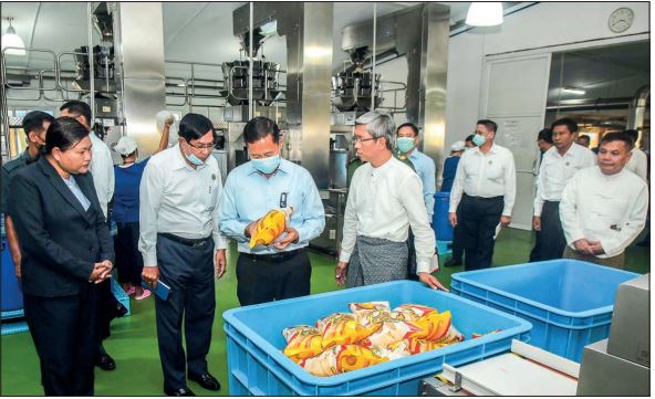 In the afternoon, the Vice-Senior General visited the FAME pharmaceutical factory, OK canned and dried noodle factory, Htoo Thit fish/shrimp feedstuff factory, fish meal factory and TOP cashew nut factory in Hlinethaya Township.
