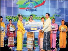 At the Grand Final contest, academy award winner Daw Cho Pyone presented awardee Soe Htet Aung from Ayeyawady Region while the second prize winner Ma Htun Pa Pa Aung from Yangon Region by academy award winner Nay Aung and third prize winner Ma Pu Tuu by singer Khine Wah.