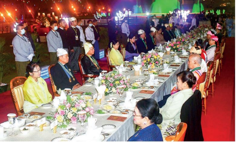 The dinner was attended by the Senior General and wife, the Vice-Senior General and wife, the SAC Secretary, the SAC Joint Secretary, council members and their wives, Vice-President (Retd) Thray Sithu Dr Sai Mauk Kham and his wife, Vice-President (Retd) Thray Sithu U Nyan Tun and wife, families of heads of state who had served State duties in successive eras, senior military officers, Union ministers, officials, ambassadors and charges d’affaires of foreign embassies, honorary consuls, representatives from NCA signatory ethnic armed organizations and NCA non-signatories and guests.