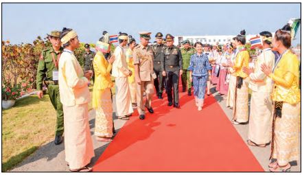 The Chief of Defence Forces of the Royal Thai Armed Forces and party were warmly welcomed at the airport by Chief of the General Staff (Army, Navy and Air) General Maung Maung Aye and wife, senior military officers from the Office of the Commander-in-Chief and their wives, the commander of Western Command, the military attaché of the Royal Thai Armed Forces to Myanmar and officials.