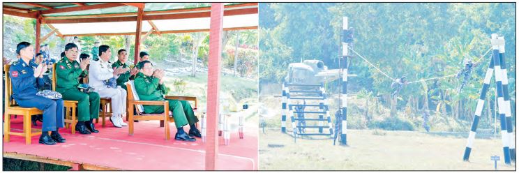 STATE Administration Council Chairman Commander-in-Chief of Defence Services Senior General Min Aung Hlaing, together with his wife Daw Kyu Kyu Hla, Chief of the General Staff (Army, Navy and Air) General Maung Maung Aye and wife, Commander-in-Chief (Navy) Admiral Moe Aung and wife, Commander-in-Chief (Air) General Tun Aung and wife and officials, inspected training session of local Naval Central Diving and Salvage Depot near Thandwe of Rakhine State and progress of military building measures yesterday morning.