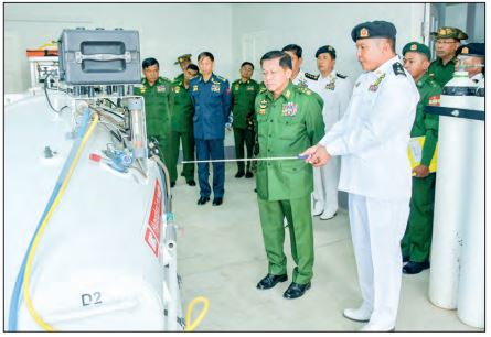 The Senior General and party watched an underwater disturbance exercise, dual air-sharing exercise, and swimming underwater with the use of the underwater compass. They also viewed round the 10 Men Hyperbaric Medical Treatment Chamber, the Diving Tower and the escape training of members of the Tatmadaw (Navy).