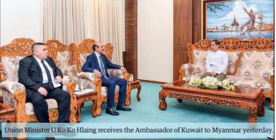 During the call, the Union minister extended congratulations to the ambassador on his recent appointment as Ambassador Extraordinary and Plenipotentiary of the State of Kuwait to the Republic of the Union of Myanmar. They cordially exchanged views on matters related to the enhancement of the existing cooperation between Myanmar and Kuwait particularly in trade, investment and energy sectors as well as on continued collaboration between the two countries in regional and multilateral fora on the basis of mutual understanding and support.