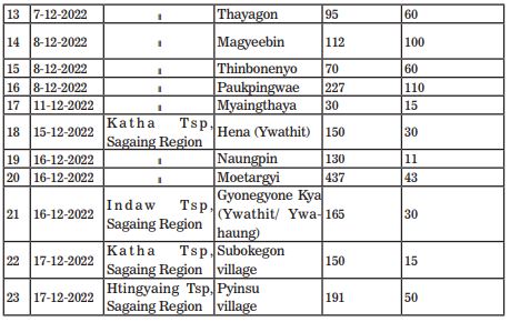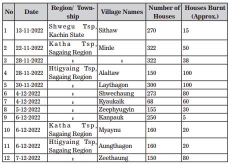 According to the findings of the investigations at the scenes, it is reported that combined armed groups comprising NUG/PDF terrorists and KIA insurgents had burnt down a total of 22 villages, causing 23 fire outbreaks in which 1,122 houses of innocent villagers were destroyed in the fire in November and December 2022.