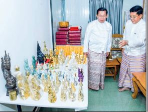 During the specific period, the Pali Sayadaw and the Senior General put the golden boxes containing the horoscope chart of the Buddha, precious jewellery and international silver coins donated by devotees, well-wishers and donors and stone inscriptions into the designated reliquaries in the centre of the jewelled throne of the Buddha image following the customs.
