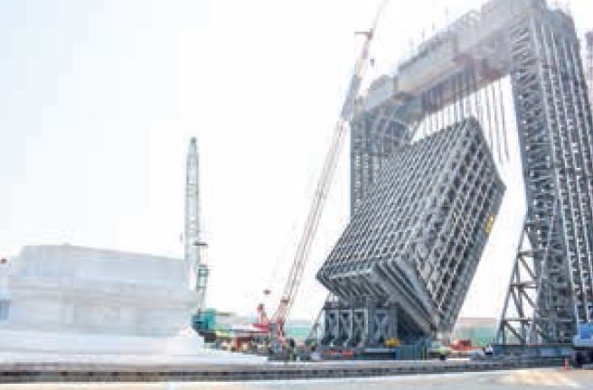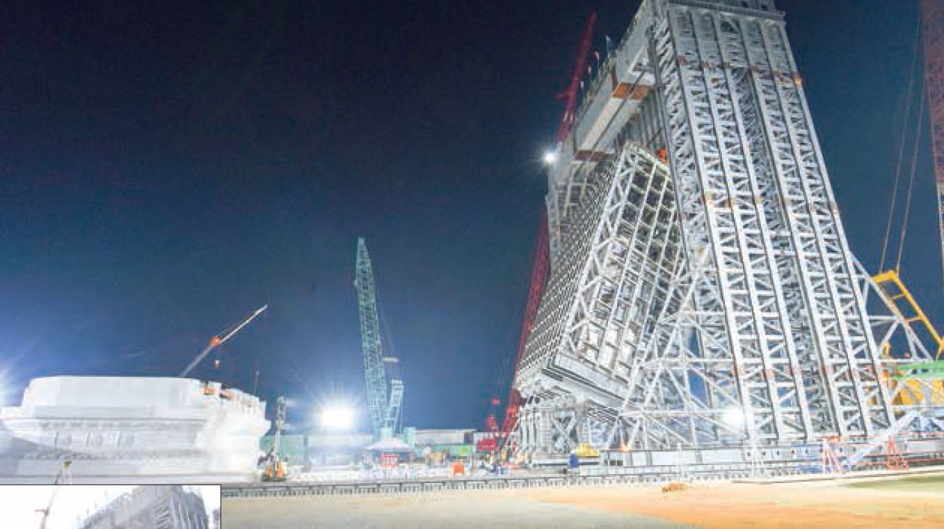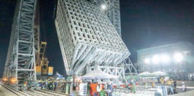 A steel crane is being used in lifting the Maravijaya Buddha Image on the jewelled throne. The image was lifted up to 68.6° at midnight yesterday.