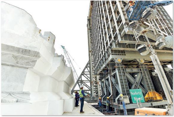 The conveyance of the 90° lifted image onto the jewelled throne continued at 11:16 pm on 29 January and it was getting close to the jewelled throne at 10:17 am on 30 January when the distance was 81 feet, and the process took 11 hours and one minute.