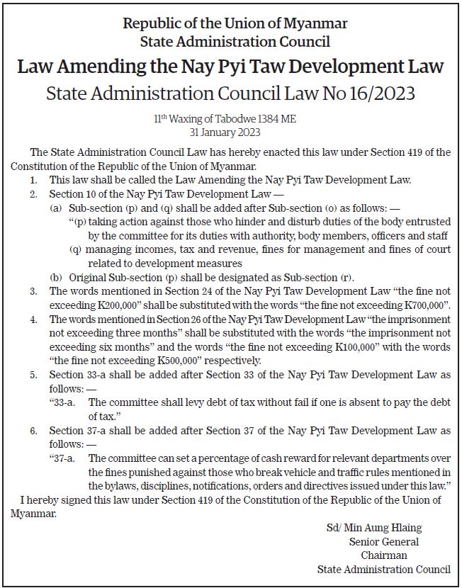 Submitted by moiuser on 1 February 2023 Republic of the Union of Myanmar State Administration Council Law Amending the Nay Pyi Taw Development Law State Administration Council Law No 16/2023