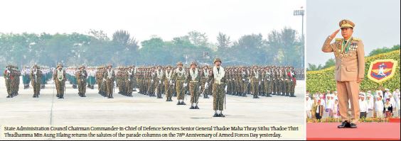 CHAIRMAN of the State Administration Council Commander-in-Chief of Defence Services Senior General Thadoe Maha Thray Sithu Thadoe Thiri Thudhamma Min Aung Hlaing delivered an address atthe Parade of the 78th Anniversary of Armed Forces Day which falls on 27 March 2023 at the Nay Pyi Taw Parade Ground yesterday morning.