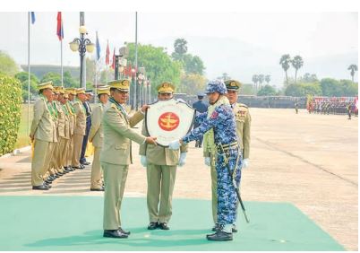 Then, Chief of the General Staff (Army, Navy and Air) General Maung Maung Aye gave trophies and cash awards to the Office of Commander-in-Chief (Air) for group flying, parade company representing the Office of Commander-in-Chief (Air) that won third prize for model company, parade company representing Directorate of Military Engineers that won second prize for the model company and parade company representing Office of Commander-in-Chief (Navy) that won first prize for model company.