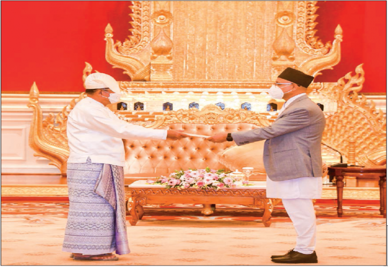 CHAIRMAN of the State Administration Council Prime Minister Senior General Min Aung Hlaing accepted the Credentials from the newly accredited Nepali Ambassador to Myanmar Mr Harishchandra Ghimire at the Credentials Hall of the Office of the SAC Chairman in Nay Pyi Taw at 10:45 am yesterday.