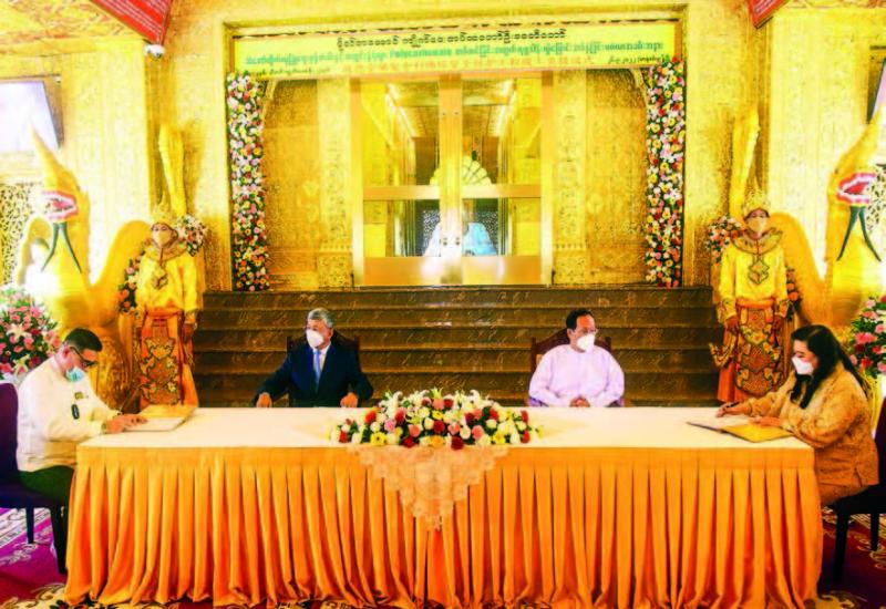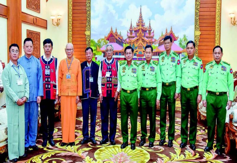 CHAIRMAN of the State Administration Council Commander-in-Chief of Defence Services Senior General Min Aung Hlaing received the peace delegations led by Vice-Chairman of United Wa State Party (UWSP) U Lau Yaku, Vice-Chairman of National Democratic Alliance Army (NDAA) U San Pae and Vice-Chairman-2 of Shan State Progress Party (SSPP) Sao Khun Seng at the parlour of Bayintnaung Villa in Nay Pyi Taw yesterday morning to talk about peace issues.