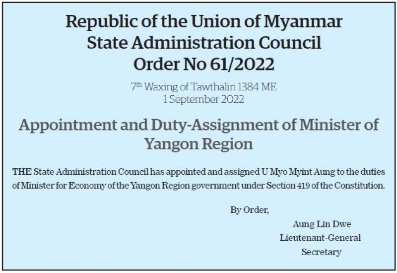Republic of the Union of Myanmar State Administration Council Order No 61/2022