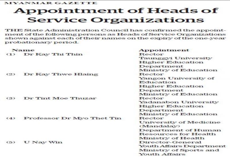 THE State Administration Council has confirmed the appointment of the following persons as Heads of Service Organizations shown against each of their names on the expiry of the one-year probationary period.