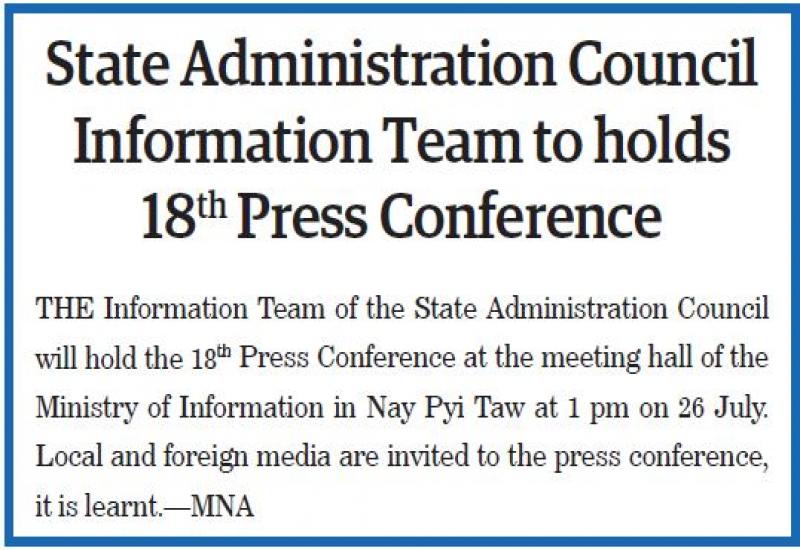 THE Information Team of the State Administration Council will hold the 18th Press Conference at the meeting hall of the Ministry of Information in Nay Pyi Taw at 1 pm on 26 July. Local and foreign media are invited to the press conference, it is learnt. MNA