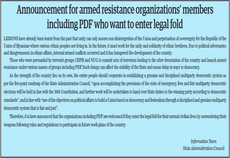 AS Chairman of the State Administration Council Prime Minister Senior General Min Aung Hlaing on 22 April called for peace talks with ethnic armed organizations-EAOs to restore perpetual peace in the country and an end to the armed conflicts, a peace delegation led by Vice Chair of the Arakan Liberation Party (ALP) Daw Saw Mra Razar Lin left Sit- tway, Rakhine State by Tatmadaw aircraft, for Nay Pyi Taw yesterday morning.