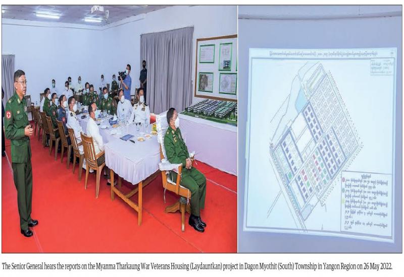 CHAIRMAN of the State Administration Council Commander-in-Chief of Defence Services Senior General Min Aung Hlaing, yesterday afternoon, inspected progress in the construction of Myanma Tharkaung War Veterans Housing (Laydauntkan) in Dagon Myothit (South) Township in Yangon Region.