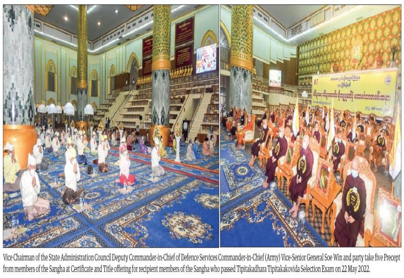 ceremony to honour 20 members of the Sangha who passed the 74th Tipitakadhara Tipitakakovida selection examination organized by the Ministry of Religious Affairs and Culture was held in conjunction with the certificate presentation ceremony at Maha Pasana Cave on Kaba Aye Hill in Yangon yesterday morning.