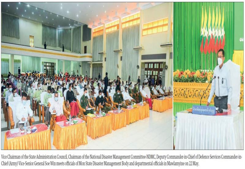 VICE Chairman of the State Administration Council, Chairman of the National Disaster Management Committee-NDMC, Deputy Commander-in-Chief of Defence Services Commander-in-Chief (Army) Vice-Senior General Soe Win met with the people affected by natural disaster due to the heavy rains from 20 May in Mawlamyine, Chaungzon, Thanbyuzayat, Thaton and Paung townships, officials of the Mon State Disaster Management bodies and department officials in Mawlamyine yesterday.