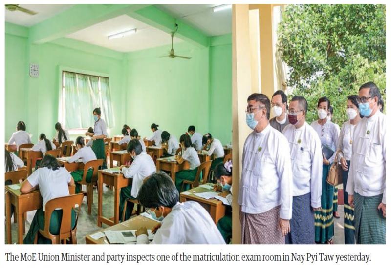 UNION Minister for Education Dr Nyunt Pe, together with Deputy Ministers Dr Zaw Myint and U Zaw Win, Permanent Secretary Dr Soe Win, and Director-General of the Department of Basic Education U Kyaw Swa Thwin visited the Matriculation Examination Centre at No (6) Basic Education High School (Nay Pyi Taw) yesterday. They inspected students sitting the first-day Matriculation Examination in Myanmar Subject.