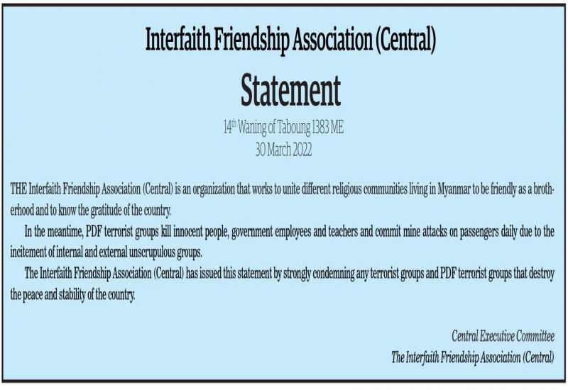 Interfaith Friendship Association (Central) strongly condemn any terrorist groups and PDF terrorist groups that destroy peace and stability of the country