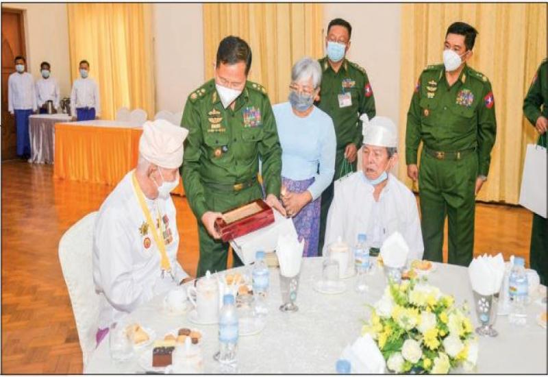 VICE-CHAIRMAN of the State Administration Council Deputy Commander-in-Chief of Defence Services Commander-in-Chief (Army) Vice-Senior General Soe Win and wife Daw Than Than Nwe cordially met with two Independence Mawgun Second Class award winners and three Independence Mawgun Third Class award winners, totalling five who attended the 77th Anniversary Armed Forces Day Parade ceremony at Bayintnaung Yeiktha in Nay Pyi Taw yesterday.
