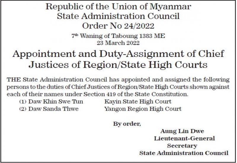 Appointment and Duty-Assignment of Chief Justices of Region/State High Courts #TheGlobalNewLightOfMyanmar